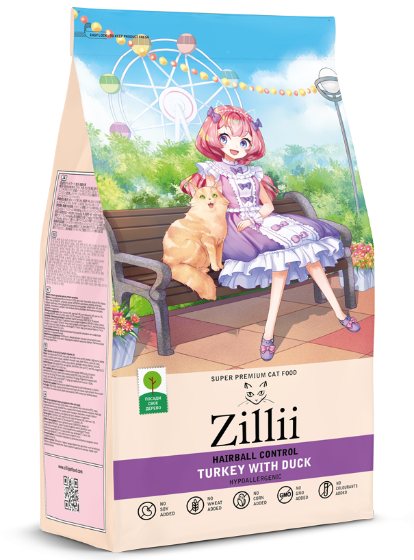 Состав полнорационного корма ZILLII HAIRBALL CONTROL способствует профилактике образования комочков шерсти в желудочно-кишечном тракте кошки. Различные типы клетчатки стимулируют естественный кишечный транзит. В результате чего, ежедневно попадающая в желудочно-кишечный тракт шерсть выводится из организма естественным образом, что и препятствует формирование комочков в ЖКТ у животного. Рецептура ZILLII HAIRBALL CONTROL учитывает все особенности организма кошки, так как изготовлена на основе дегидрированного мяса индейки и свежего мяса утки.