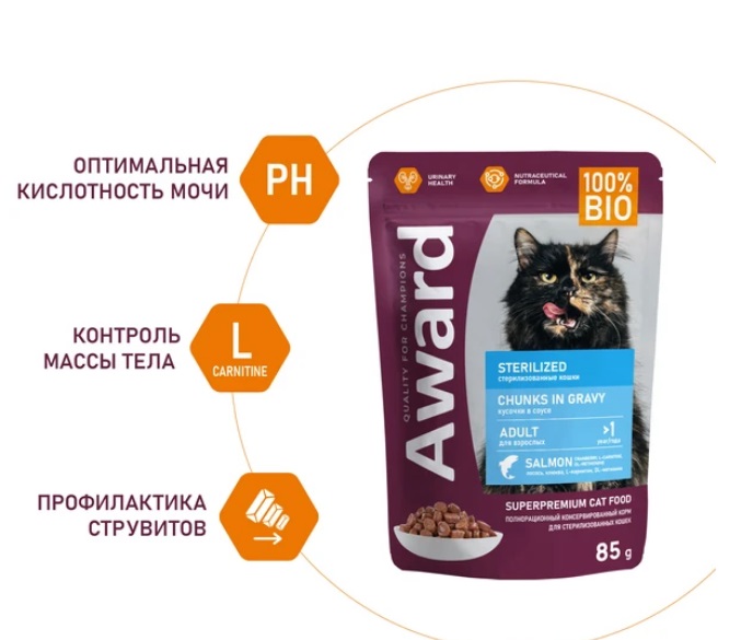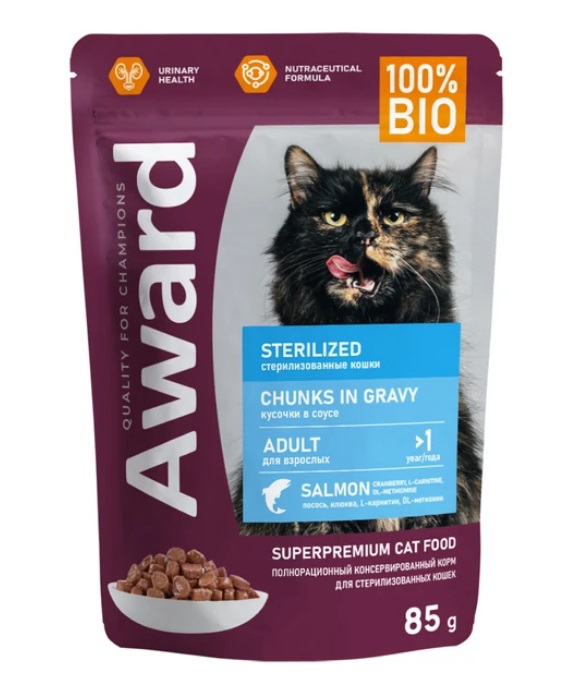 AWARD Sterilized пауч для стерилизованных кошек кусочки в соусе с лососем 85г.