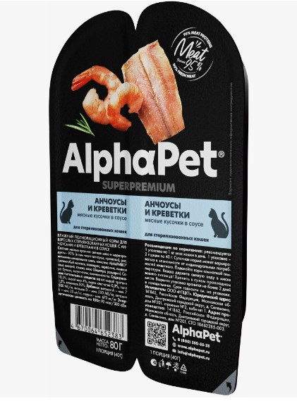 Состав:Мясные кусочки: свежее мясо и морепродукты - 90% (в том числе анчоусы, креветки), рис, витаминно-минеральная смесь, комплекс AlphaPetBIO (зеленогубый моллюск, календула, одуванчик, льняное семя, цикорий, клюква, юкка Шидигера, розмарин). Соус: бульон, загустители, аминокислоты.