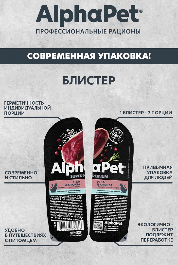 Корм для кошек влажный AlphaPet Superpremium - суперпремиальное питание на основе натуральных ингредиентов. Линейка питания для животных, владельцы которых хотят быть уверены в лучшем выборе корма для кошек для своего питомца. Максимально открытый и понятный состав продукта, приготовленного по инновационной технологии из свежего мяса и с содержанием более чем 90% мясного белка!