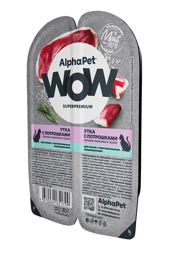 Состав: 90% свежее мясо и субпродукты (утка, курица), рис, витаминно-минеральная смесь, функциональный комплекс AlphaPet®BIO (зеленогубый моллюск, календула, одуванчик, льняное семя, цикорий, клюква, Юкка Шидигера, розмарин), бульон, загустители, аминокислоты.