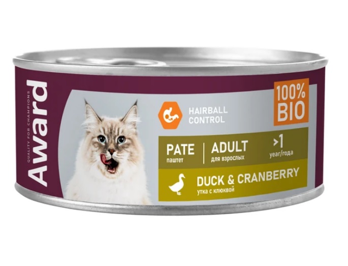 AWARD Влажный корм для взрослых кошек паштет из утки с клюквой 100г