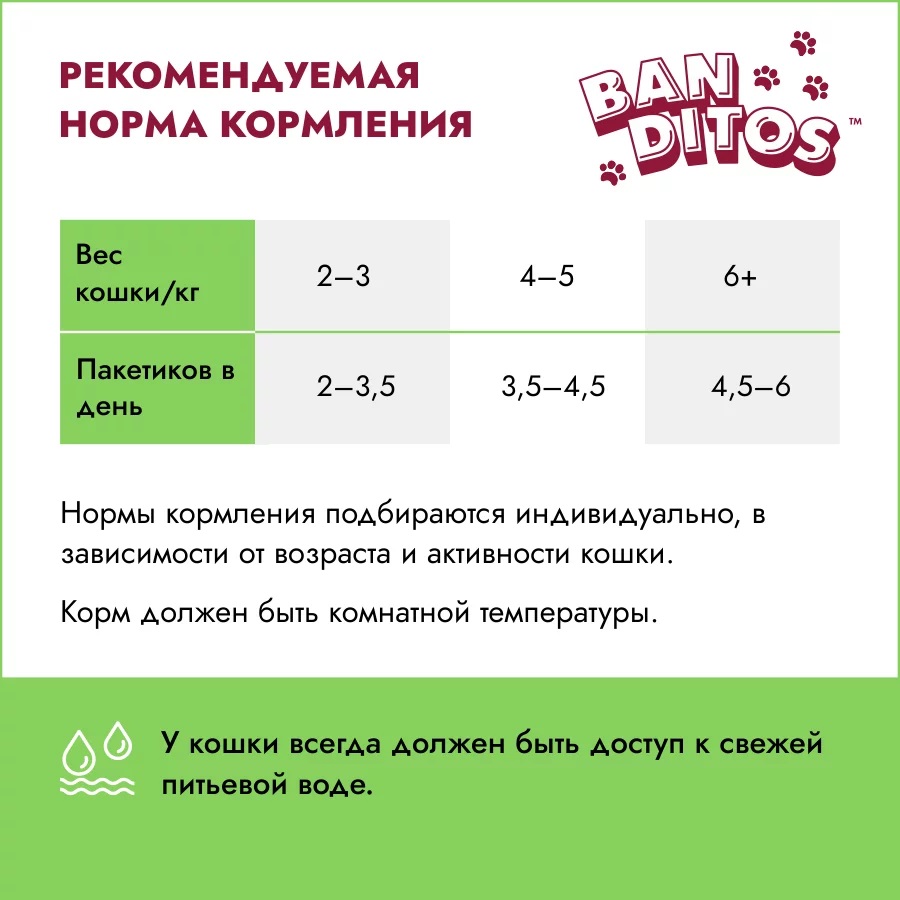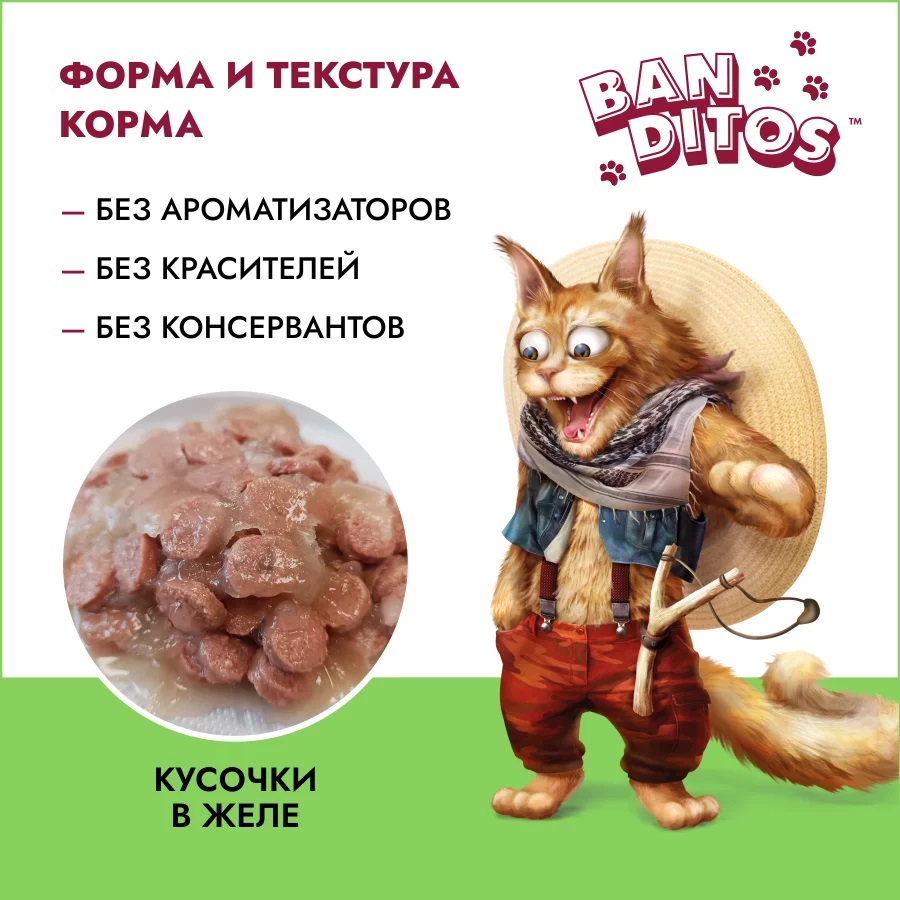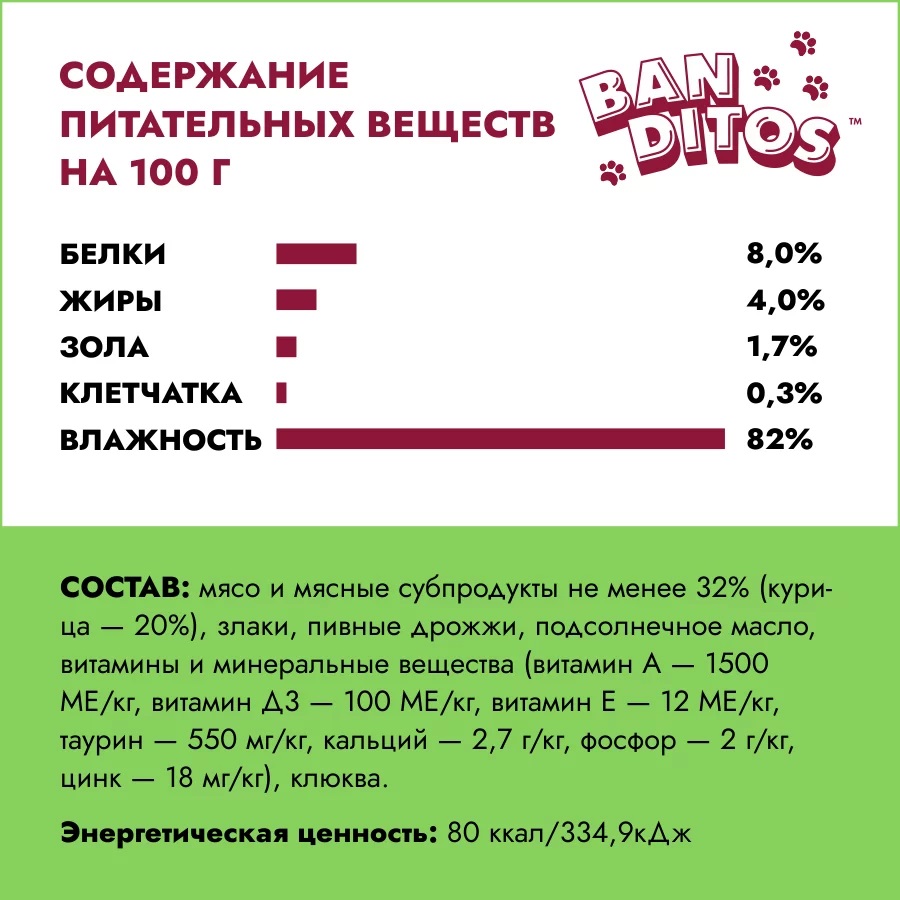 Влажный корм Banditos с курицей в желе — не десерт, не просто угощенье для кошек, а полноценный рацион. Годится он для всех: шкодливых и сообразительных, недотрог и баловней. В нём найдётся всё, что нужно для питомца круглый год — минералы, витамины, пребиотики — и не нужен огород! Даже ягоды лесные. Клюквы видите кусочек? Для здоровья нежных почек. Ну, а мясо, потрошки — коту лучшие дружки. От макушки до хвоста он ухожен неспроста. Ешь, усатый, ты как надо — и хозяйка будет рада! Только, чур, не объедаться. Если норму затвердит — будет стройным ваш бандит!