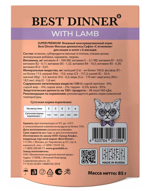 Пищевая ценность: Влажность - 85%, Сырой протеин - 8%, Сырой жир - 6%, Сырая зола - 2%, Таурин - 0,2%
