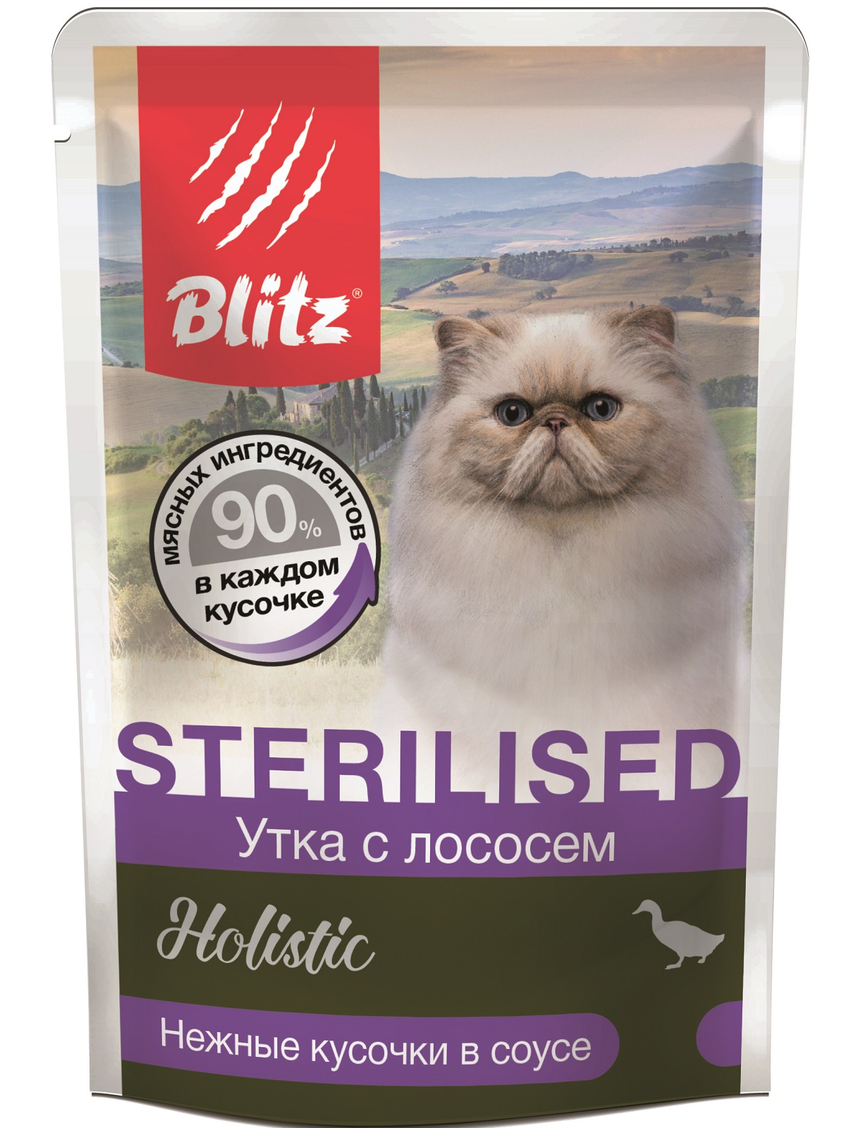 Корм Blitz Holistic Sterilised Cat Duck & Salmon in Gravy - это восхитительная смесь вкуса, пользы и нежности, которую наверняка оценят ваши питомцы!