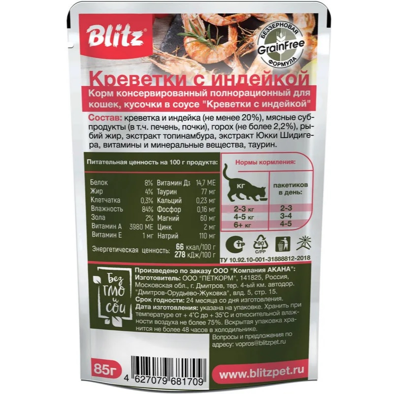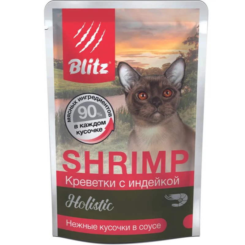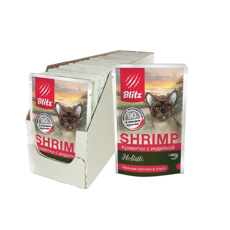 Влажный корм для кошек «Креветки с индейкой»– настоящая жемчужина линейки Blitz Holistic.