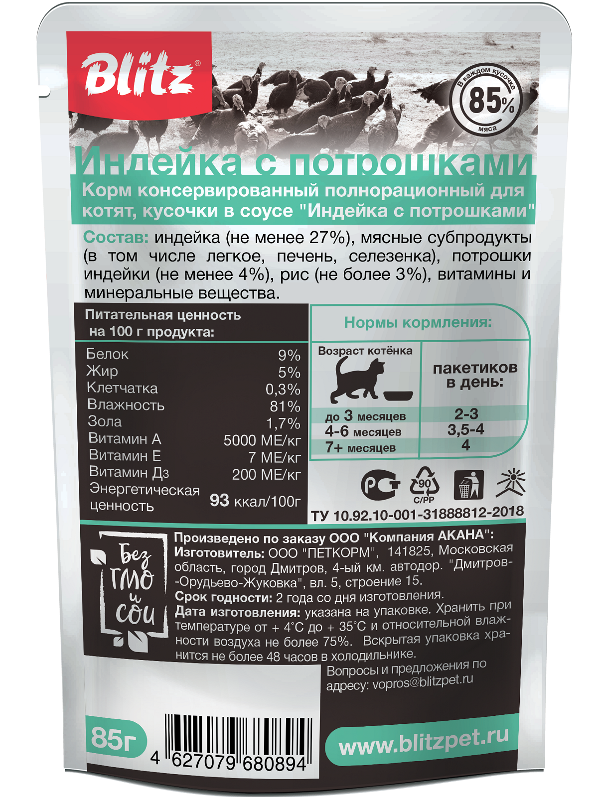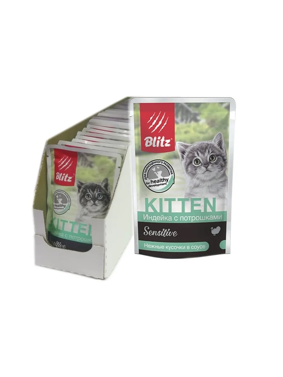 Влажный корм для котят с индейкой и потрошками, набор из 24 шт., пауч 85 гр.