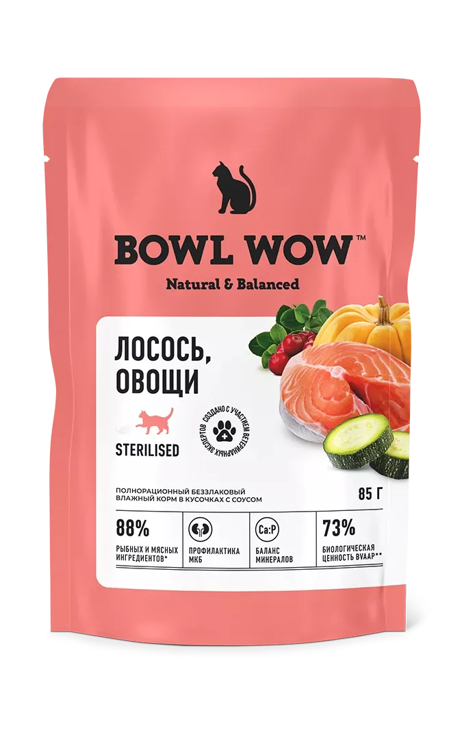 Собственная рецептура: не менее 88% высококачественных рыбных и мясных ингредиентов в каждом кусочке с высокой усвояемостью белка 73% (технология BVaap). Полноценный аминокислотный профиль для вашего питомца без избыточной нагрузки на почки. Формула с правильным энергетическим профилем для контроля веса стерилизованного питомца.