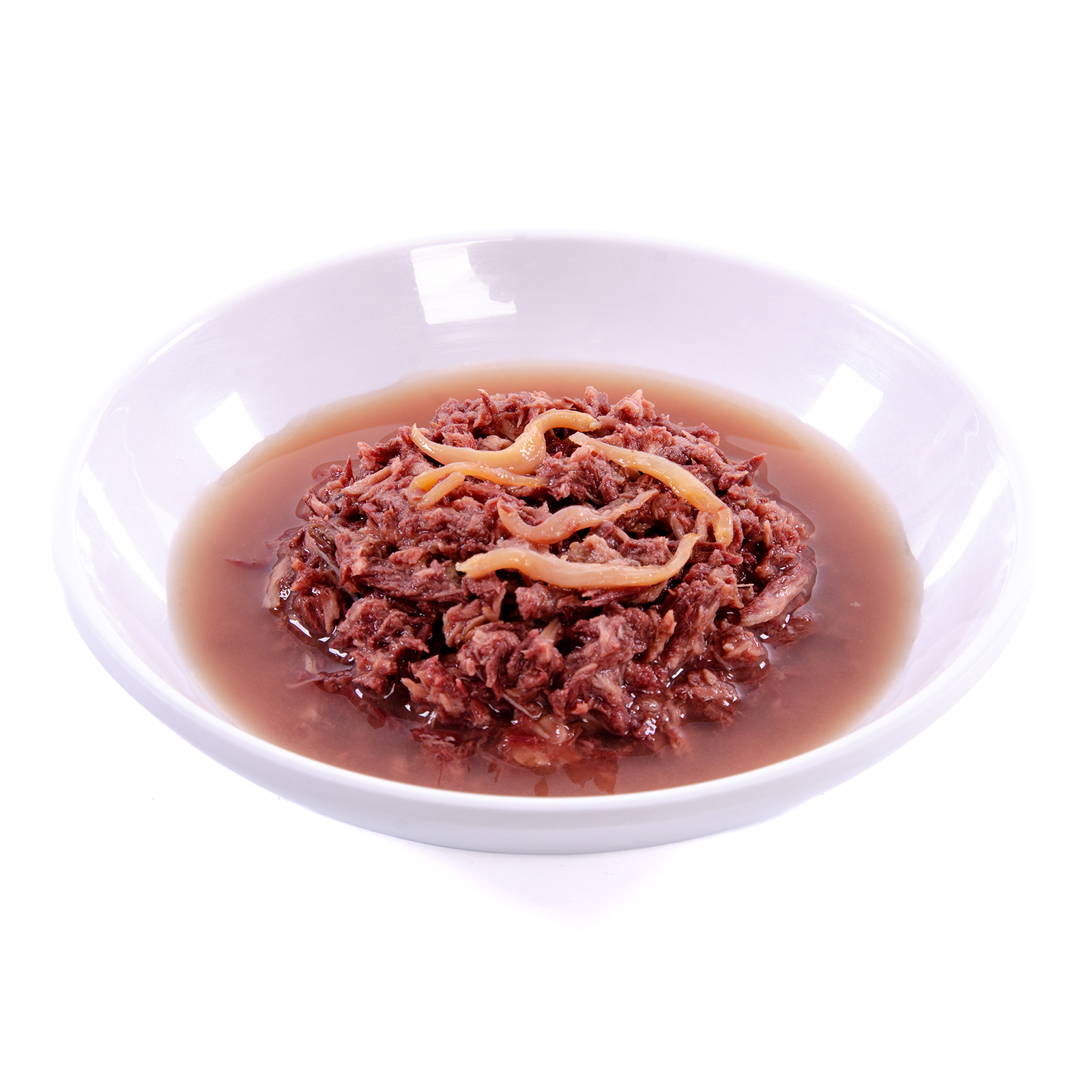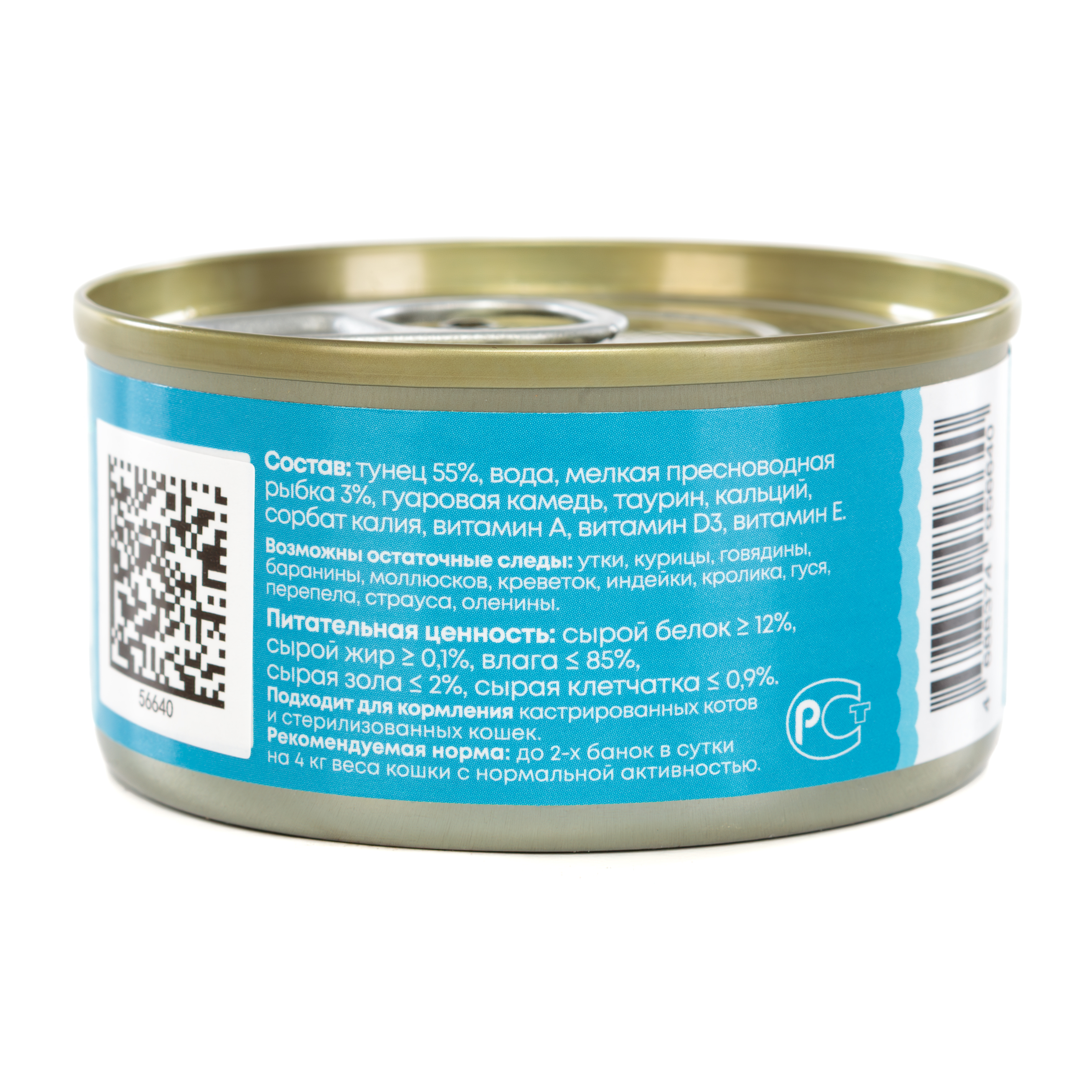 Состав: Тунец 55%, вода, мелкая пресноводная рыбка 3%, гуаровая камедь, таурин, карбонат кальция, сорбат калия, витамин А, витамин D3, витамин Е. Питательная ценность: сырой белок ≥ 12,0% ,сырой жир ≥ 0,1% , влажность ≤ 85,0%, сырая зола ≤ 2%, сырая клетчатка ≤ 0,9%.