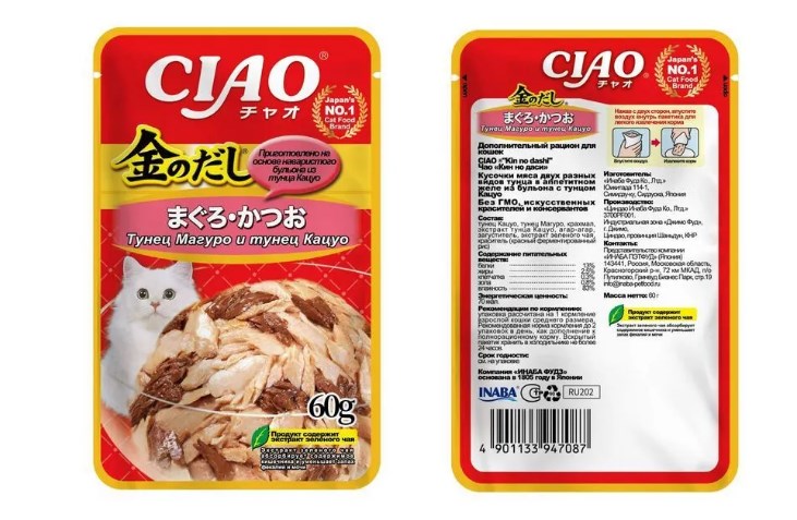 Суперпремиальный влажный корм для кошек Kinnodashi от японского производителя Inaba приготовлен на основе нежных кусочков мяса двух разных видов глубоководного тунца в аппетитном насыщенном бульоне золотистого цвета.
