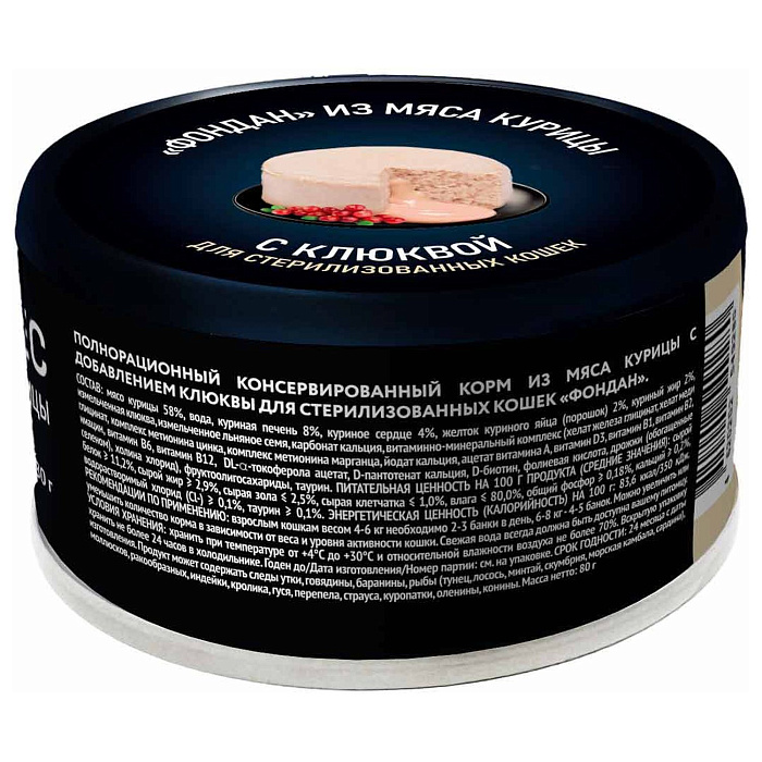 В основе рациона свежее куриное мясо (58%), витамины и минералы, а также незаменимая аминокислота таурин, которые обеспечивают сбалансированное питание на каждый день. Высокое содержание влаги и измельченная клюква профилактируют инфекции мочевыделительной системы.