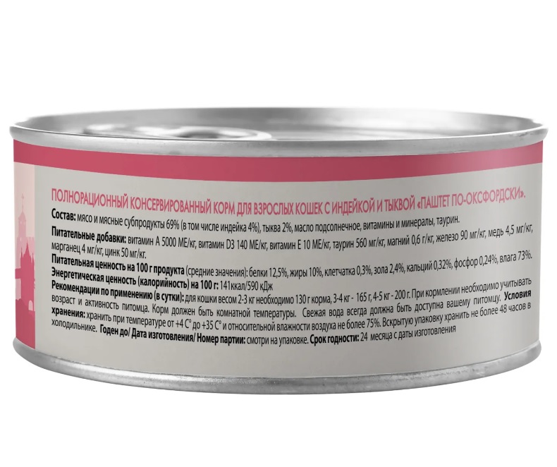 Полнорационный сбалансированный влажный корм с индейкой и тыквой для кошек старше 12 месяцев, созданный по мотивам блюд высокой кухни. "Паштет по-оксфордски" содержит высокое количество животного белка (69%), тыкву, таурин, а также все необходимые витамины и минералы для поддержания здоровья и активности кошки на протяжении всей ее жизни. Без ГМО, сои, искусственных красителей и ароматизаторов.