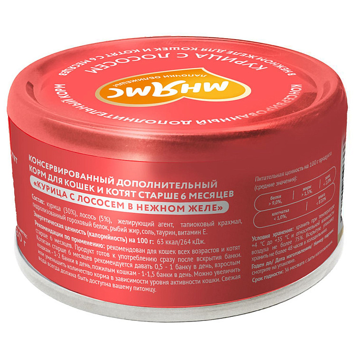 Прекрасно подходит привередливым кошкам, а также питомцам со сниженным потреблением воды. «Мнямс» консервированный дополнительный корм для для кошек и котят старше 6 месяцев «Курица в нежном желе" гарантирует, что ваш питомец получит только качественный и вкусный продукт, который прекрасно разнообразит его рацион, поддержит здоровье и обеспечит энергией.