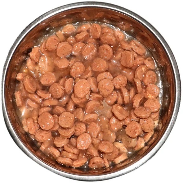 мясо и мясные субпродукты не менее 36% (телятина 12%), злаки, кальций, витамины и минералы.