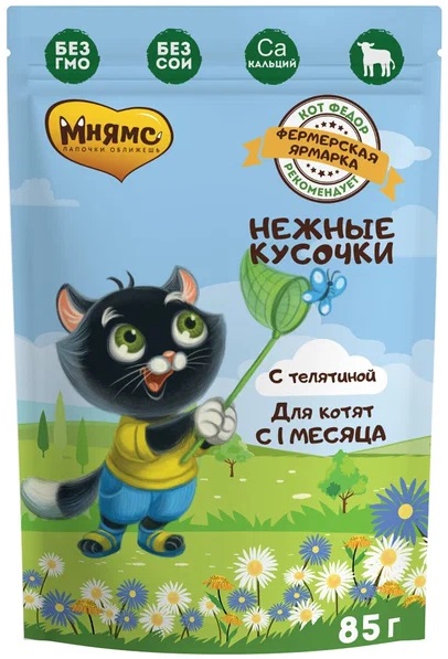 Влажный корм с Фермы кота Фёдора - это сбалансированный рацион, который обязательно понравится вашему котенку. Нежный аромат кусочков с телятиной... и озорной любопытный котенок со всех лап несется к миске, чтобы пополнить запас сил для новых открытий, активных игр и дня, полного приключений. В корме 36% Мясных ингредиентов, а еще...Нет ГМО, сои, консервантов, ароматизаторов, усилителей вкуса и искусственных красителей. Кот Фёдор рекомендует!