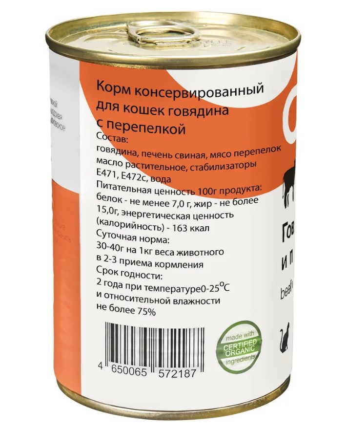 Фарш куриный, субпродукты куриные, субпродукты свиные, говядина (не менее 4%), перепелка (не менее 1%), рис, масло растительное, животный белок, мясокостная мука, желирующая добавка, крахмал, плазма крови, вода.
