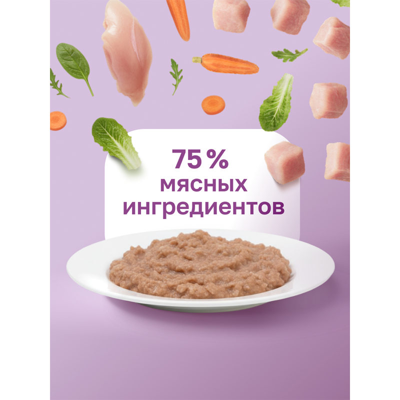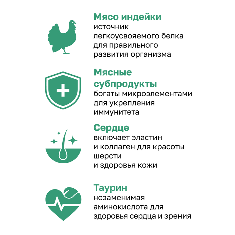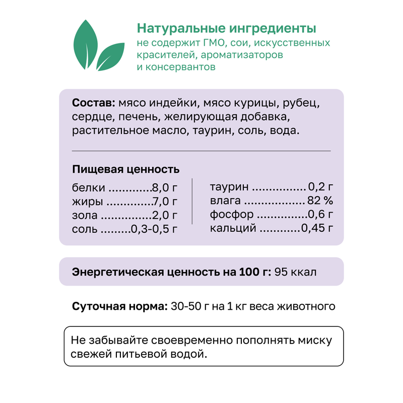 ✅ 100% свежее мясо — в составе только натуральные мясные ингредиенты: мясо индейки, курицы, а также рубец, сердце и печень. Никаких искусственных добавок, заменителей и растительного белка.