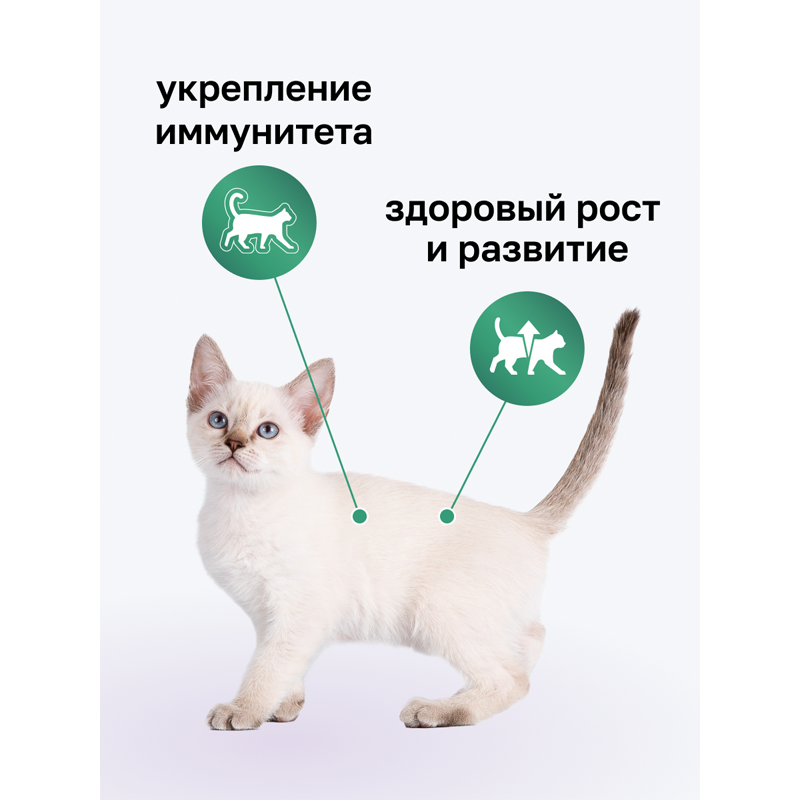 ✅ Сбалансированный состав — оптимальное соотношение белков (8,0%) и жиров (7,0%) обеспечивает котёнка энергией для активного роста и развития.