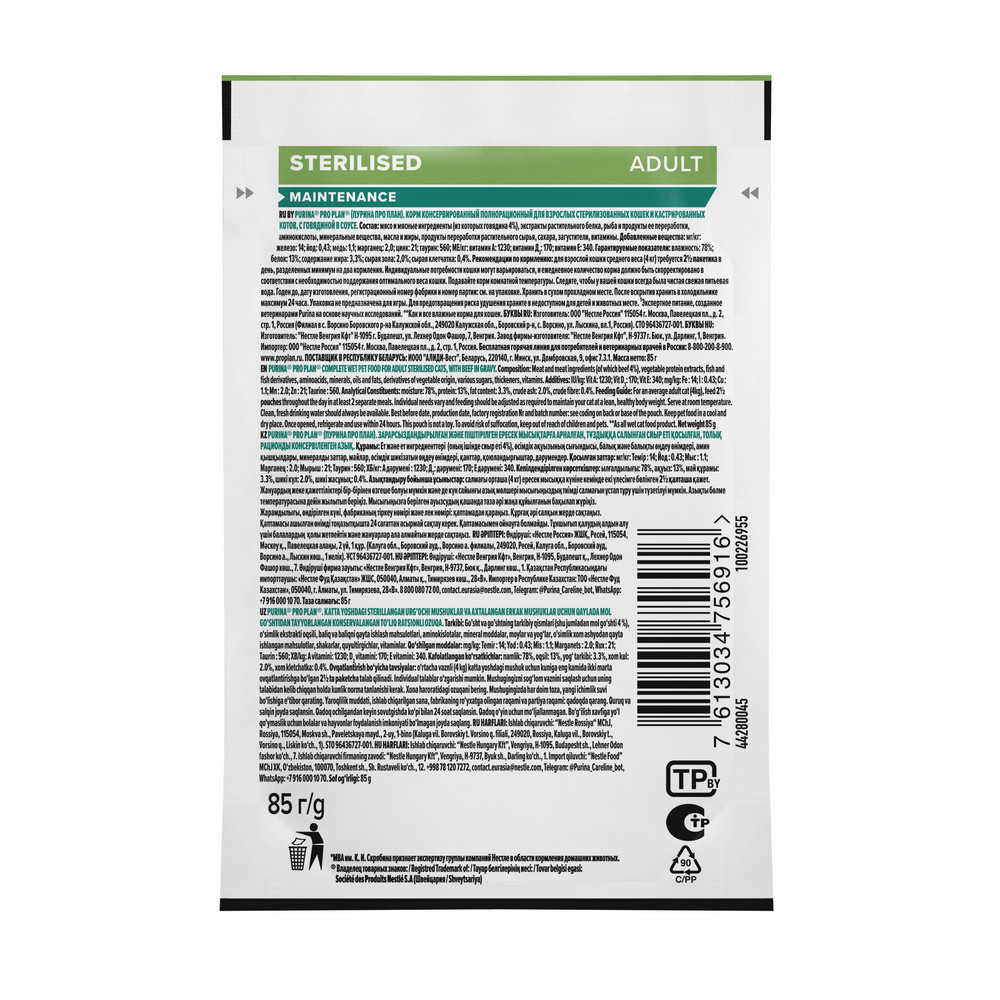 Влажный корм для стерилизованных кошек с говядиной, набор из 26 шт., пауч 85 гр.