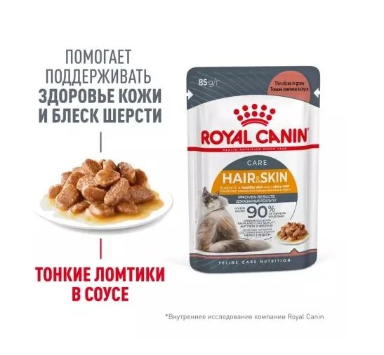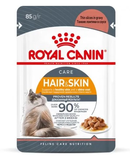 Формула ROYAL CANIN® Hair & Skin Care (ХЭЙР ЭНД СКИН КЭА), тонкие ломтики в соусе, обогащена жирными кислотами Омега-3 и Омега-6, необходимыми для здоровой кожи и красивой, блестящей шерсти.