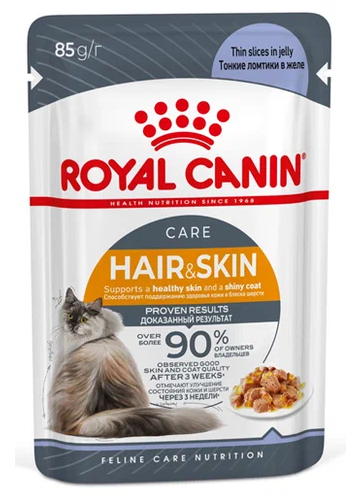 Корм консервированный полнорационный для взрослых кошек (тонкие ломтики в желе) HAIR & SKIN CARE (ХЭЙР ЭНД СКИН КЭА), подходящий для взрослых кошек с чувствительной кожей или проблемной шерстью в возрасте старше 1 года, специально разработан с учетом потребностей в питательных веществах вашей кошки.