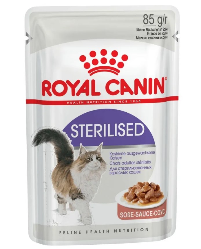 Формула влажного продукта ROYAL CANIN® Sterilised (Стерилайзд), мелкие кусочки в соусе, поддерживает оптимальный вес, способствует поддержанию здоровья мочевыделительной системы, а также соответствует инстинктивным предпочтениям кошки.