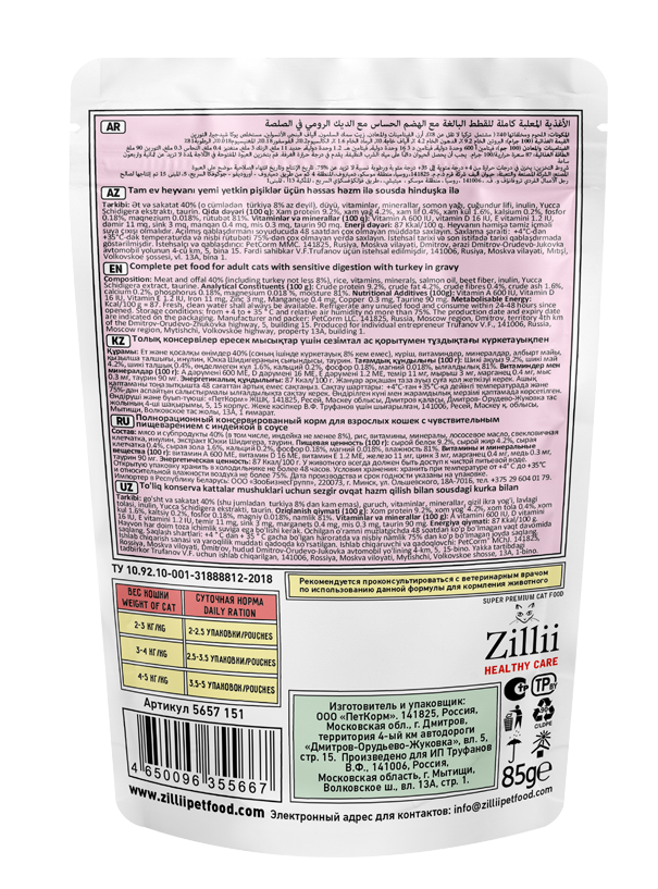 Формула влажного корма ZILLII HEALTHY CARE Sensitive Digestion создана для кошек с чувствительным пищеварением. Специально подобранные ингредиенты способствуют нормализации работы кишечника. Из рецептуры исключены основные пищевые компоненты, которые могут оказать негативное влияние именно на чувствительное пищеварение. Формула сбалансирована так, чтобы удовлетворить все потребности организма животного в питательных веществах, исключая любое негативное влияние на пищеварительную систему.