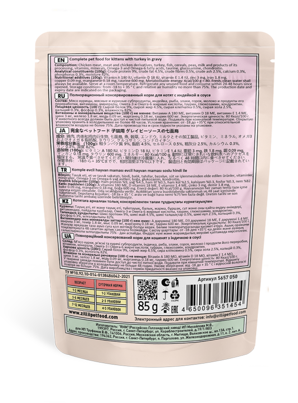 Полнорационный влажный корм ZILLII KITTEN with Turkey in gravy разработан с учетом всех потребностей и особенностей организма котенка. Повышенное содержание питательных веществ, необходимых витаминов и важных минералов поддерживают в норме работу всего организма в период активного роста котенка. В составе рецептуры присутствует мясо индейки - наиболее диетическое и «нежное» мясо, обладающее прекрасной усвояемостью и содержанием питательных веществ.