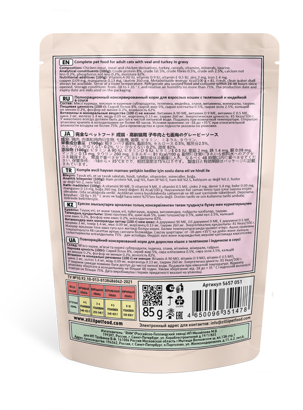 Полнорационный влажный корм для взрослых кошек ZILLII ADULT CAT with Veal and Turkey in gravy изготовлен c использованием телятины и мяса индейки. Телятина прекрасно усваивается и содержит достаточное для организма количество животных жиров, питательных веществ и микроэлементов. Индейка - полезное для кошек диетическое мясо, богатое таурином и витаминами.