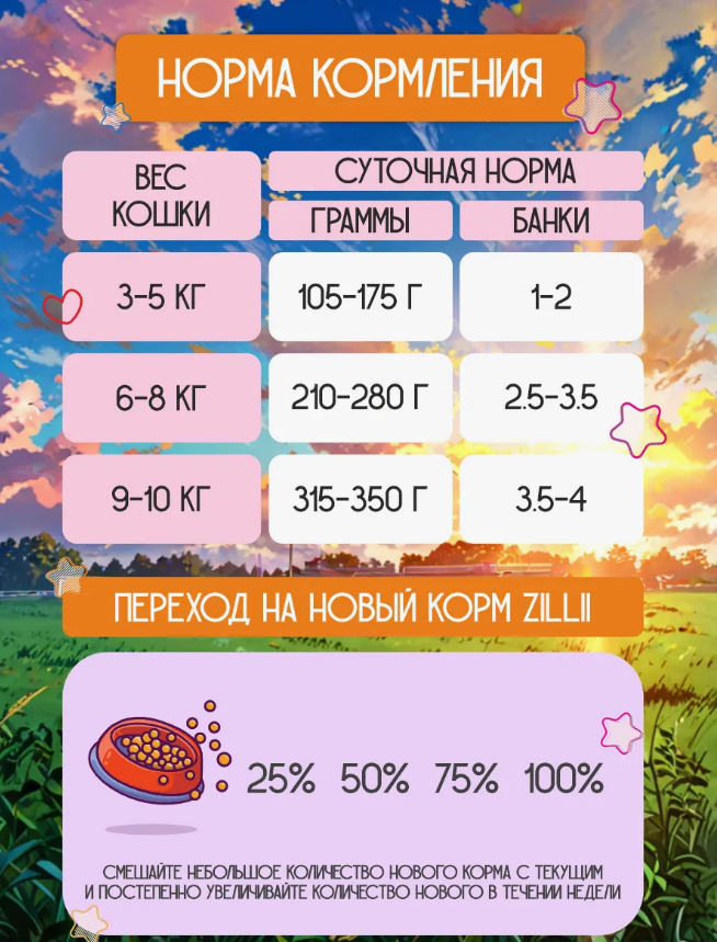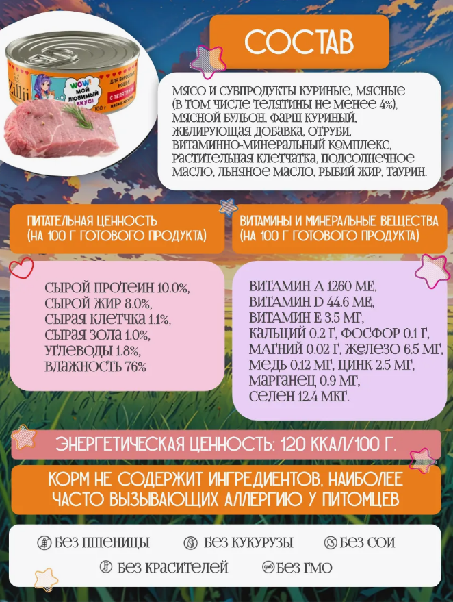 Состав: мясо и субпродукты куриные, мясные (в том числе телятины не менее 4%), мясной бульон, фарш куриный, желирующая добавка, отруби, витаминно-минеральный комплекс, растительная клетчатка, подсолнечное масло, льняное масло, рыбий жир, таурин.