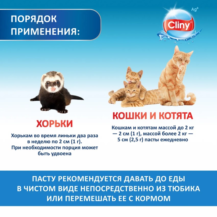 Порядок применения: Давайте пасту в чистом виде непосредственно из тюбика или перемешайте её с кормом. Кошкам и котятам массой до 2 кг — 2 см (1 г), массой более 2 кг — 5 см (2,5 г) пасты ежедневно. Хорькам во время линьки два раза в неделю по 2 см (1 г). Состав разработан компанией Neoterica (Германия). Срок годности — 2 года со дня изготовления.
