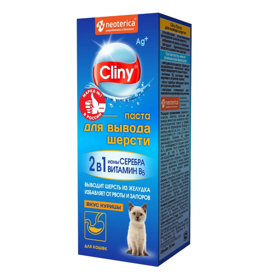 Паста для вывода шерсти Клини способствует естественному выведению комков шерсти из желудка животных.