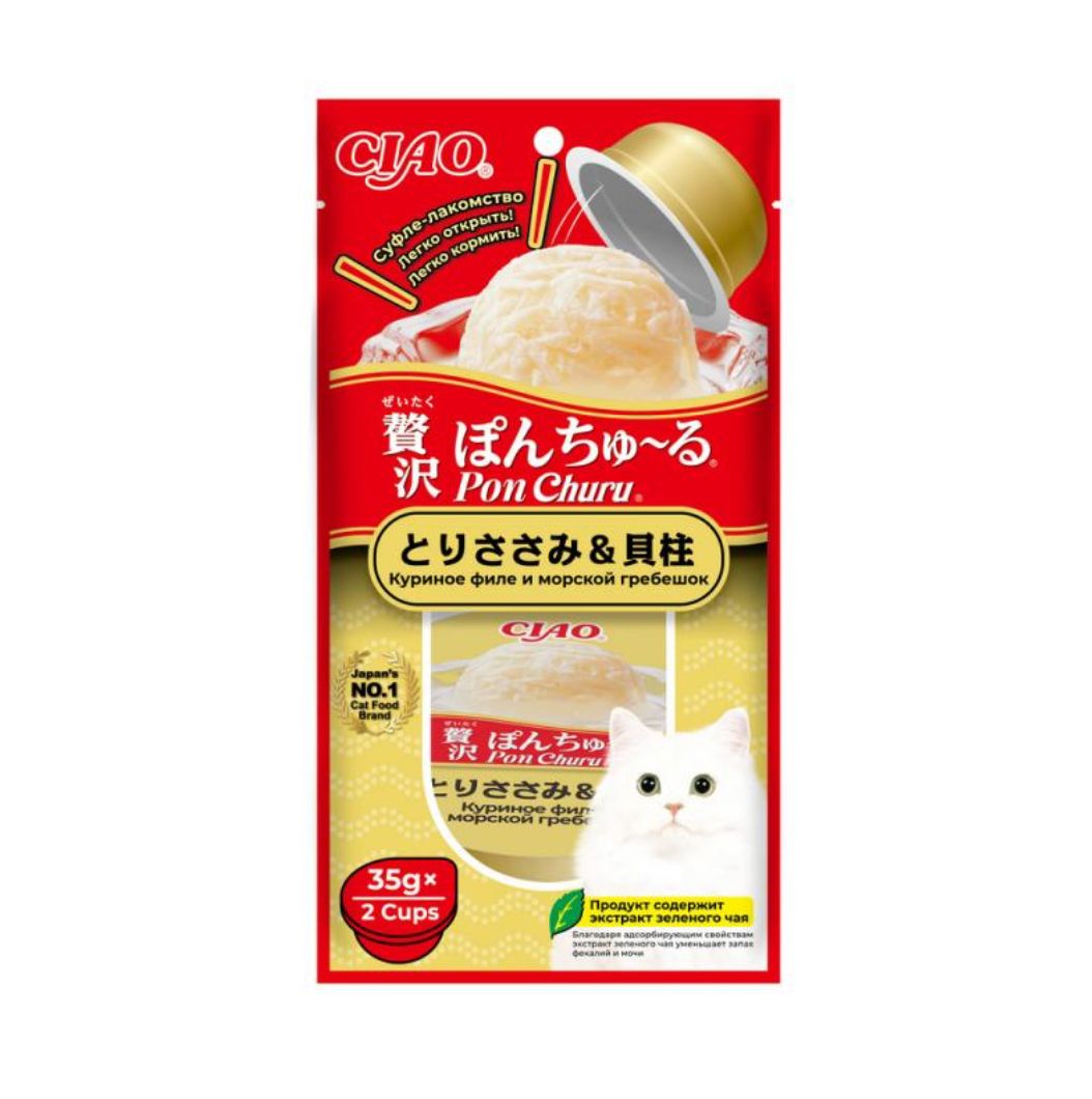 Супер-премиальное лакомство суфле CIAO Pon Churu (ЧАО ПОН ЧУРУ) для кошек на основе кусочков мяса фермерской курицы и морского гребешка от японского производителя Inaba изготовлено исключительно из натуральных полезных ингредиентов и отличается высоким процентом влажности, благодаря чему поддерживается водный баланс организма кошки. Нежная текстура, напоминяющая паштет или суфле в желе, подойдет даже самым привередливым кошкам и котам или кошкам с чувствительным пищеварением.