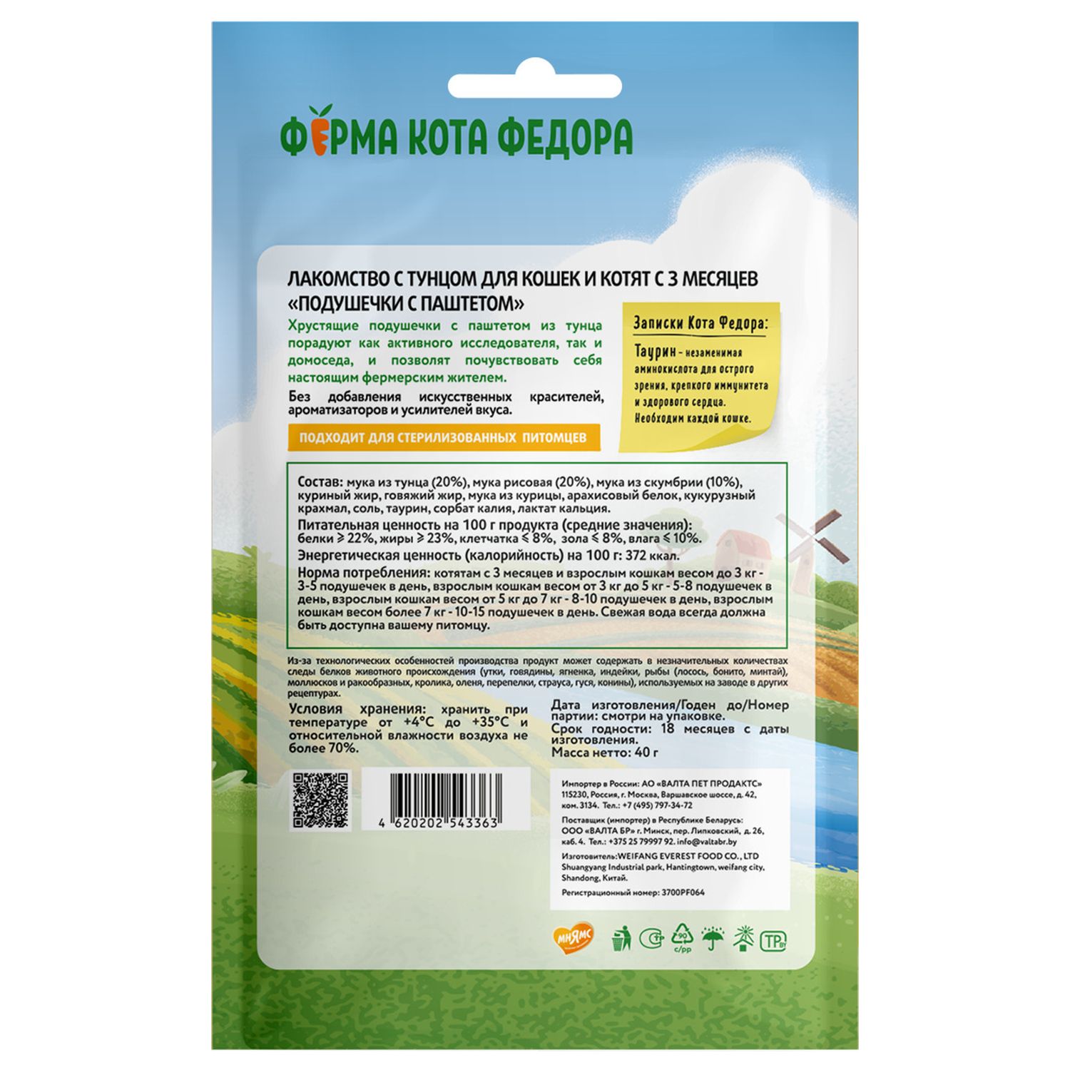 Хрустящие подушечки "Ферма кота Федора" с паштетом из тунца порадуют как активного исследователя, так и домоседа, и позволят почувствовать себя настоящим фермерским жителем. Натуральные ингредиенты с оптимальным количеством витаминов и минералов точно придутся по вкусу вашему питомцу. Без добавления исскуственных красителей, ароматизаторов и усилителей вкуса.