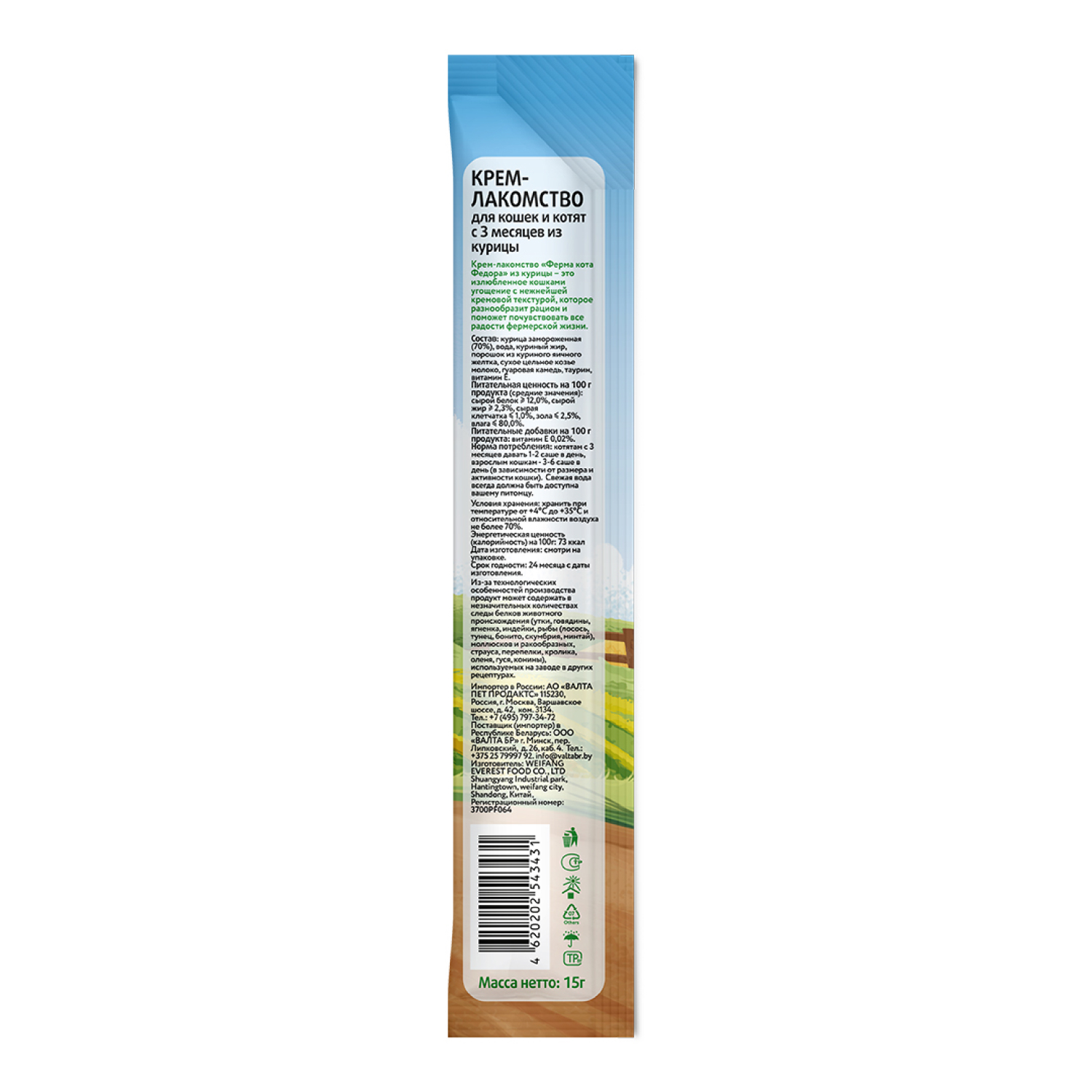 Крем-лакомство "Ферма кота Федора" из курицы - это излюбленное кошками угощение с нежнейшей кремовой текстурой, которое разнообразит рацион и поможет почувствовать все радости фермерской жизни. Подается как порционное угощение, или добавляется в виде аппетитного соуса к основному рациону для обогащения вкуса привычных блюд. Изготовлено по новейшей японской технологии и соответствует мировым стандартам качества.