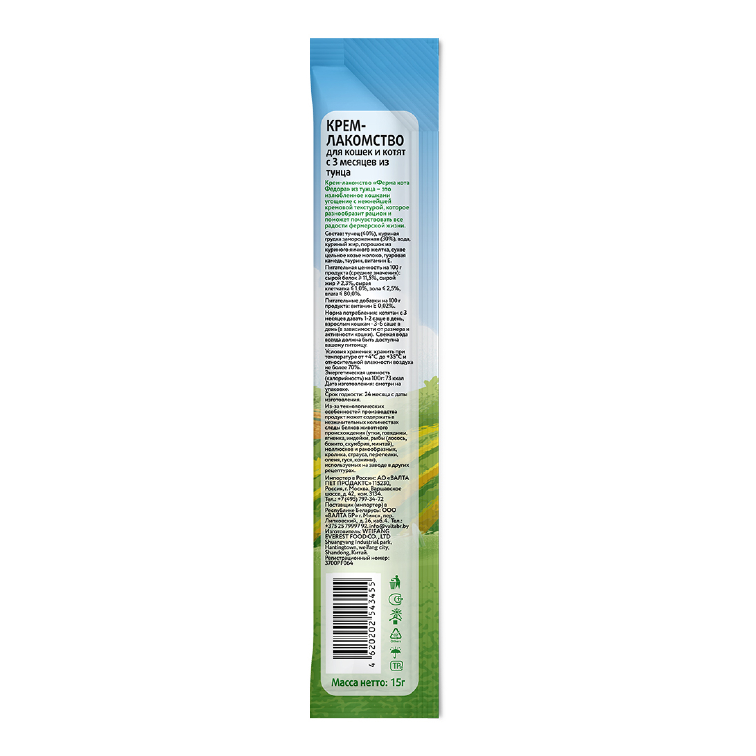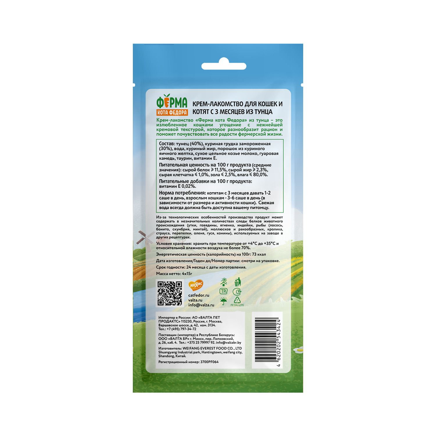 Крем-лакомство "Ферма кота Федора" из тунца - это излюбленное кошками угощение с нежнейшей кремовой текстурой, которое разнообразит рацион и поможет почувствовать все радости фермерской жизни. Подается как порционное угощение, или добавляется в виде аппетитного соуса к основному рациону для обогащения вкуса привычных блюд. Изготовлено по новейшей японской технологии и соответствует мировым стандартам качества.