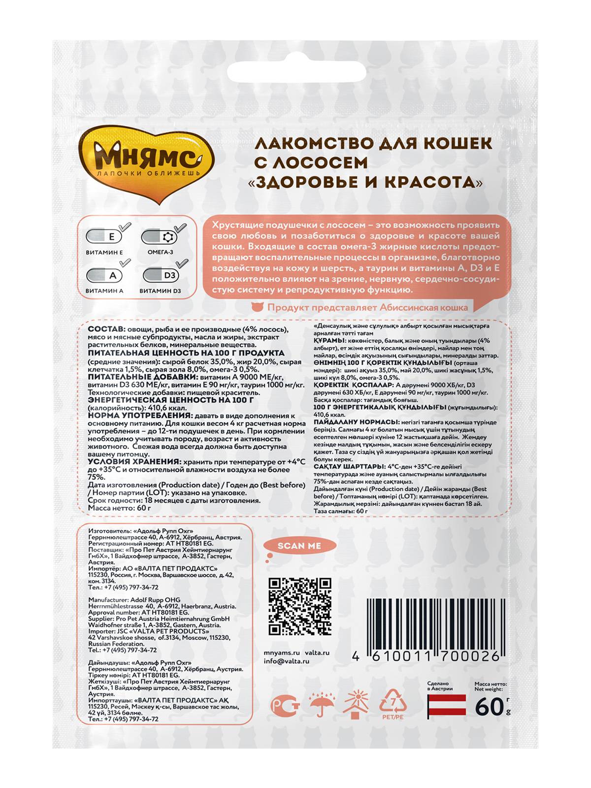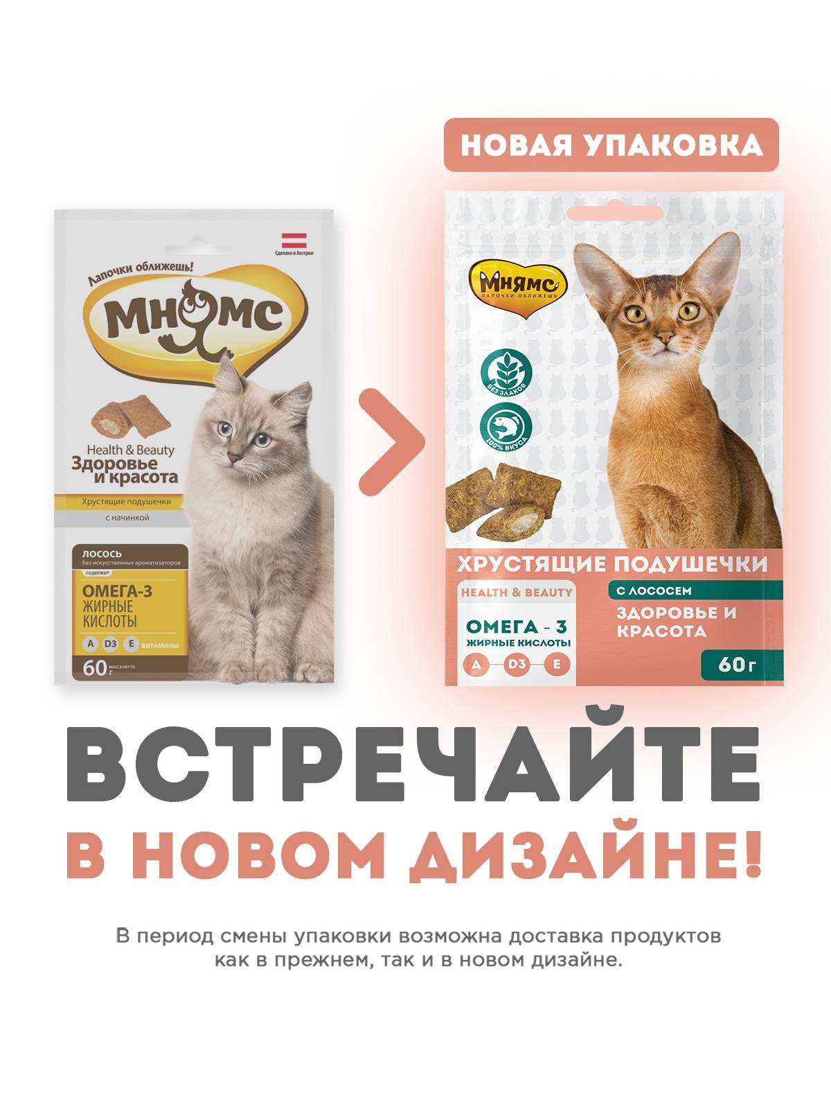 Мнямс хрустящие подушечки для кошек с лососем "Здоровье и красота" 60 г.Хрустящие подушечки «Мнямс»- это изысканное и полезное угощение, от которого не откажется даже самая привередливая и избалованная кошка. Входящий в состав Омега 3 жирные кислоты, витамины A, D3, E предотвращают воспалительные процессы в организме, благотворно воздействуют на кожу и шерсть.Норма употребления: Давать в виде дополнения к основному питанию. Можно использовать как поощрение. Свежая вода должна быть всегда доступна Вашей кошке.Правила хранения: Хранить в сухом прохладном месте, вдалеке от сильно пахнущих продуктов.