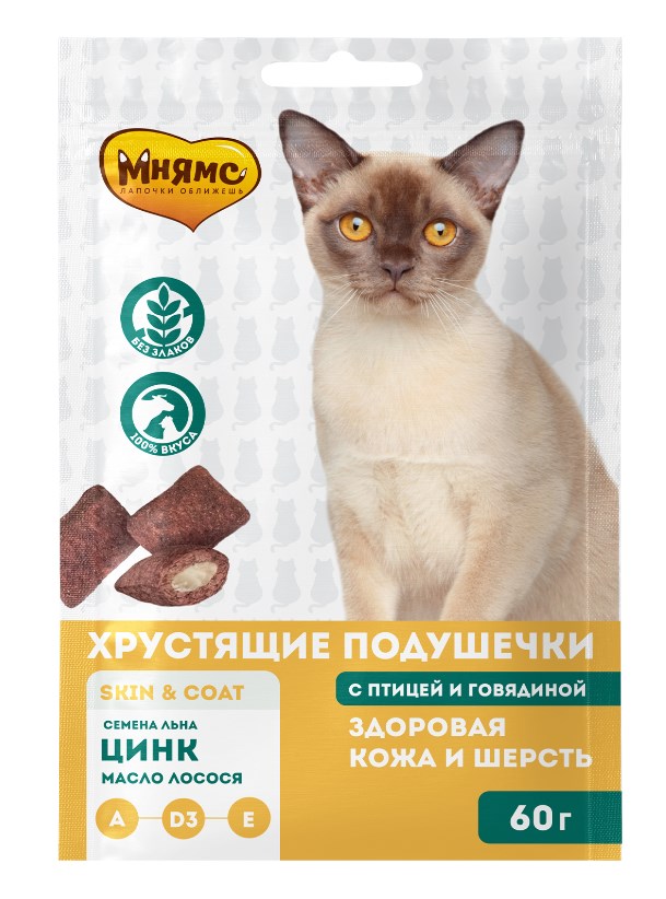 Хрустящие подушечки с птицей и говядиной - это возможность проявить свою любовь и позаботиться о здоровье и красоте вашей кошки. Входящие в состав масло лосося, семена льна и цинк благотворно влияют на здоровье кожи питомца и на качество его шерсти, предотвращая выпадение и придавая блеск.