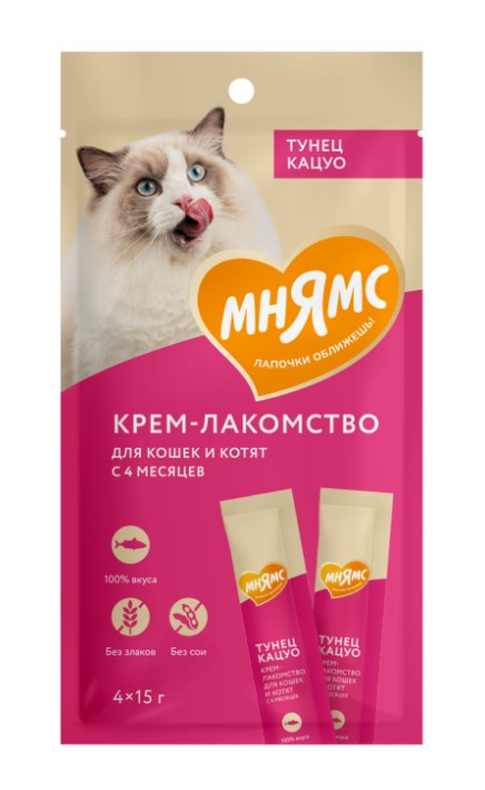 Крем-лакомство с тунцом Кацуо Тёмно-красное мясо деликатесного малого тунца Крем-лакомство «Мнямс» с тунцом – это изысканное угощение с нежнейшей кремовой консистенцией. Утонченный вкус приводит кошек в восторг, а яркие эмоции довольных любимцев при кормлении с рук дарят хозяевам ощущение полного счастья. Подается как порционное угощение, или добавляется в виде аппетитного соуса к основному рациону для обогащения вкуса привычных блюд. Изготовлено по новейшей японской технологии и соответствует мировым стандартам качества.