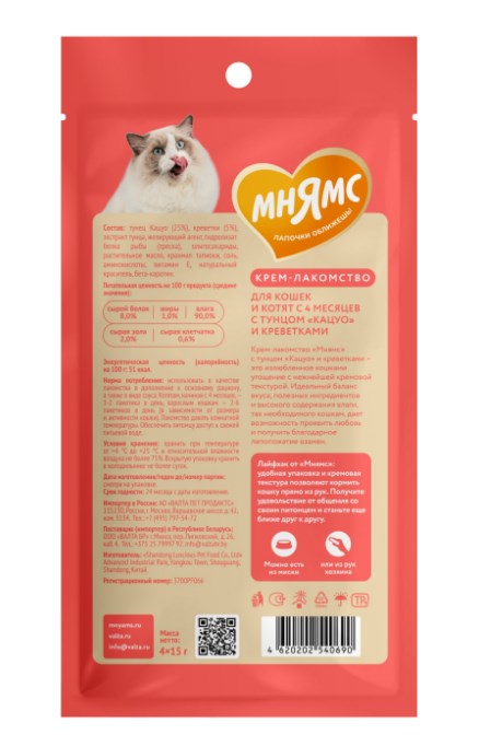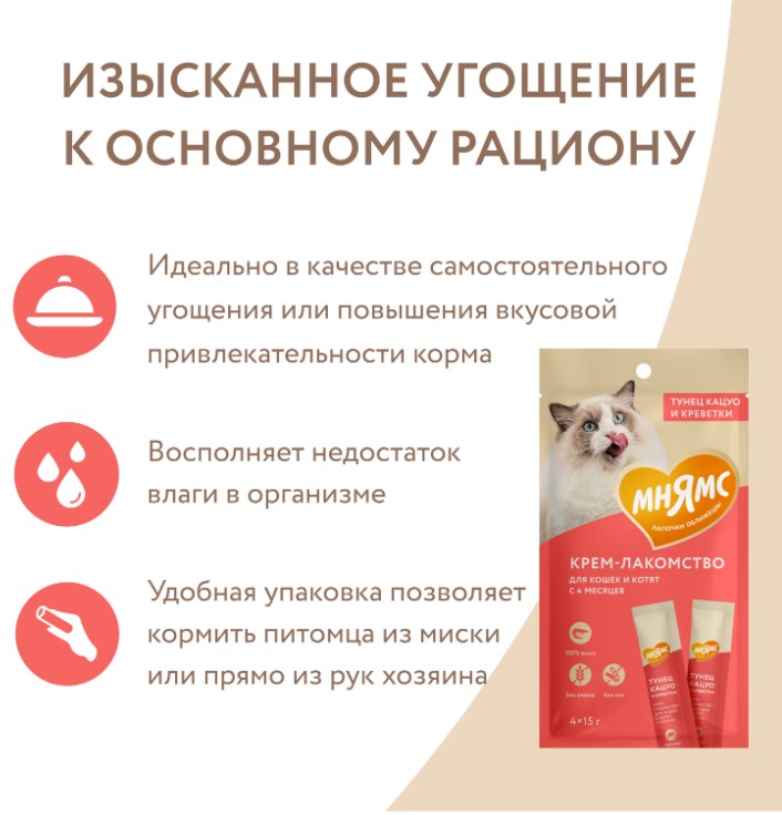 Крем-лакомство «Мнямс» с тунцом "Кацуо" и креветками – это излюбленное кошками угощение с нежнейшей кремовой текстурой. Идеальный баланс вкуса, полезных ингредиентов и высокого содержания влаги, так необходимого кошкам, дает возможность проявить любовь и получить благодарное лапопожатие взамен.