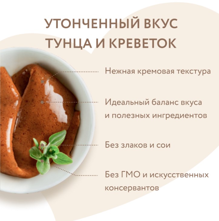 тунец Кацуо (25%), креветка (5%), экстракт тунца, желирующий агент, гидролизат белка рыбы, олигосахариды, растительное масло, крахмал тапиоки, соль, аминокислоты, витамин Е, натуральный краситель, бета-каротин.