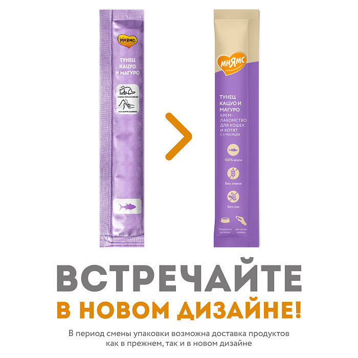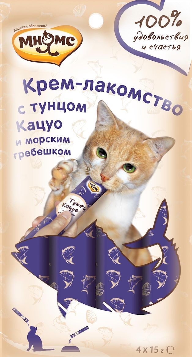 Крем-лакомство с тунцом Кацуо и Магуро Тёмно-красное мясо деликатесного малого тунца и красное стейковое мясо желтопёрого тунца Крем-лакомство «Мнямс» с тунцом – это изысканное угощение с нежнейшей кремовой консистенцией. Утонченный вкус приводит кошек в восторг, а яркие эмоции довольных любимцев при кормлении с рук дарят хозяевам ощущение полного счастья. Подается как порционное угощение, или добавляется в виде аппетитного соуса к основному рациону для обогащения вкуса привычных блюд. Изготовлено по новейшей японской технологии и соответствует мировым стандартам качества.