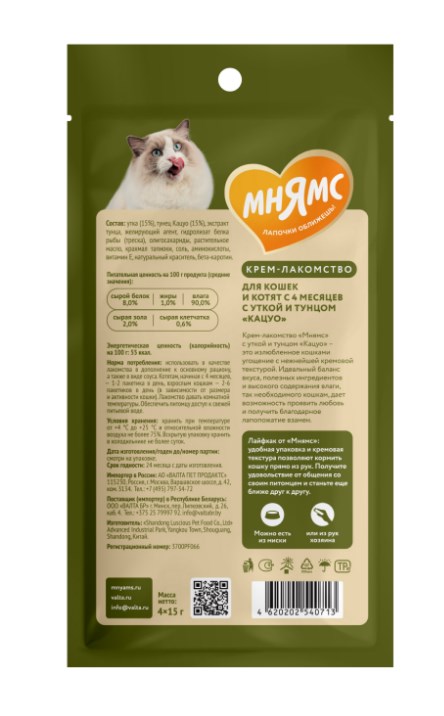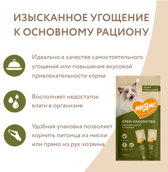 Крем-лакомство «Мнямс» с уткой и тунцом "Кацуо" – это излюбленное кошками угощение с нежнейшей кремовой текстурой.