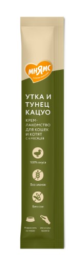 Крем-лакомство «Мнямс» с уткой и тунцом "Кацуо" – это излюбленное кошками угощение с нежнейшей кремовой текстурой. Идеальный баланс вкуса, полезных ингредиентов и высокого содержания влаги, так необходимого кошкам, дает возможность проявить любовь и получить благодарное лапопожатие взамен.