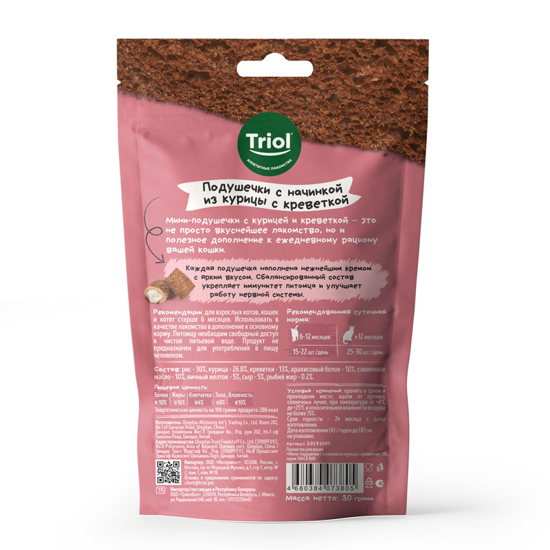 Мини-подушечки с курицей и креветкой – это не просто вкуснейшее лакомство, но и полезное дополнение к ежедневному рациону вашей кошки. Каждая подушечка наполнена нежнейшим кремом с ярким вкусом. Сбалансированный состав укрепляет иммунитет питомца и улучшает работу нервной системы.