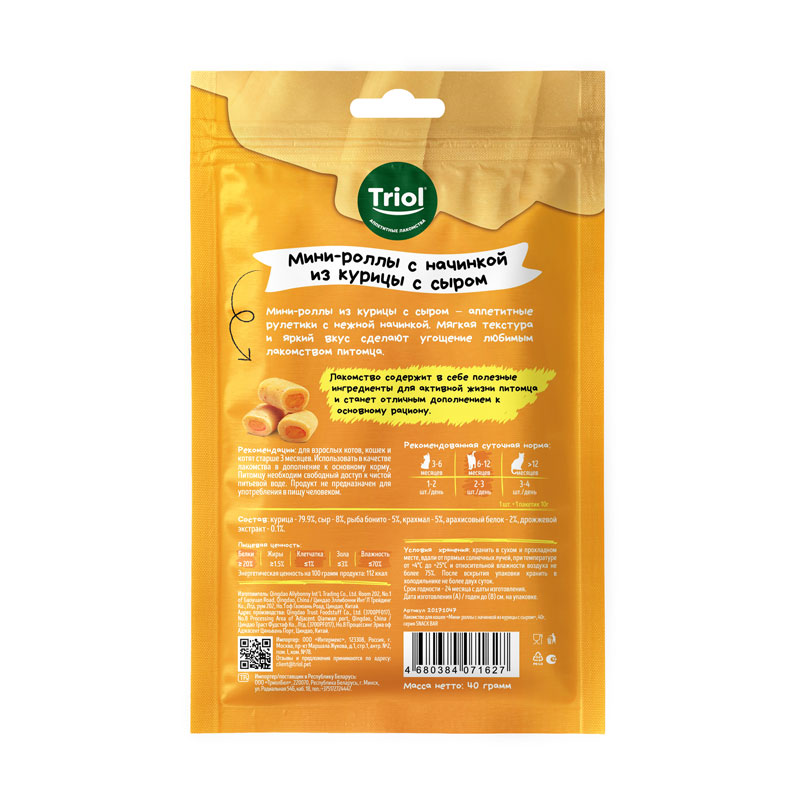 Мини-роллы из курицы с сыром – аппетитные рулетики с нежной начинкой. Мягкая текстура и яркий вкус сделают угощение любимым лакомством питомца. Лакомство содержит в себе полезные ингредиенты для активной жизни питомца и станет отличным дополнением к основному рациону.
