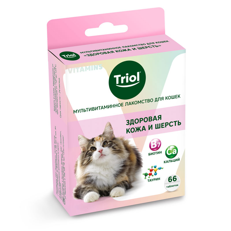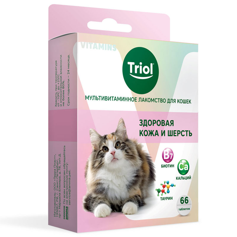 Мультивитаминное лакомство TRIOL – это источник полезных веществ, необходимых для укрепления иммунитета и обеспечения нормального обмена веществ вашей кошки. Основной рацион, как правило, содержит только базовый набор микроэлементов и не учитывает особенностей конкретного питомца, его предрасположенности к заболеваниям, а также увеличения потребности в витаминах во время стресса. Мультивитаминное лакомство TRIOL решает эти проблемы и эффективно заботится о здоровье вашего питомца. Биотин в составе лакомства положительно влияет на качество и структуру шерсти, а также препятствует появлению перхоти и сухости кожи. Таурин – важная для здоровья кошек аминокислота, наличие которой в организме способствует хорошему зрению, поддерживает работу сердечно-сосудистой системы и укрепляет иммунитет. Дефицит биотина и таурина приводит к чрезмерному выпадению шерсти, разрушению зубов и ломкости когтей, нарушению обмена веществ. Масса нетто: 33г. В упаковке: 66 таблеток. Цвет: нежно-розовый.