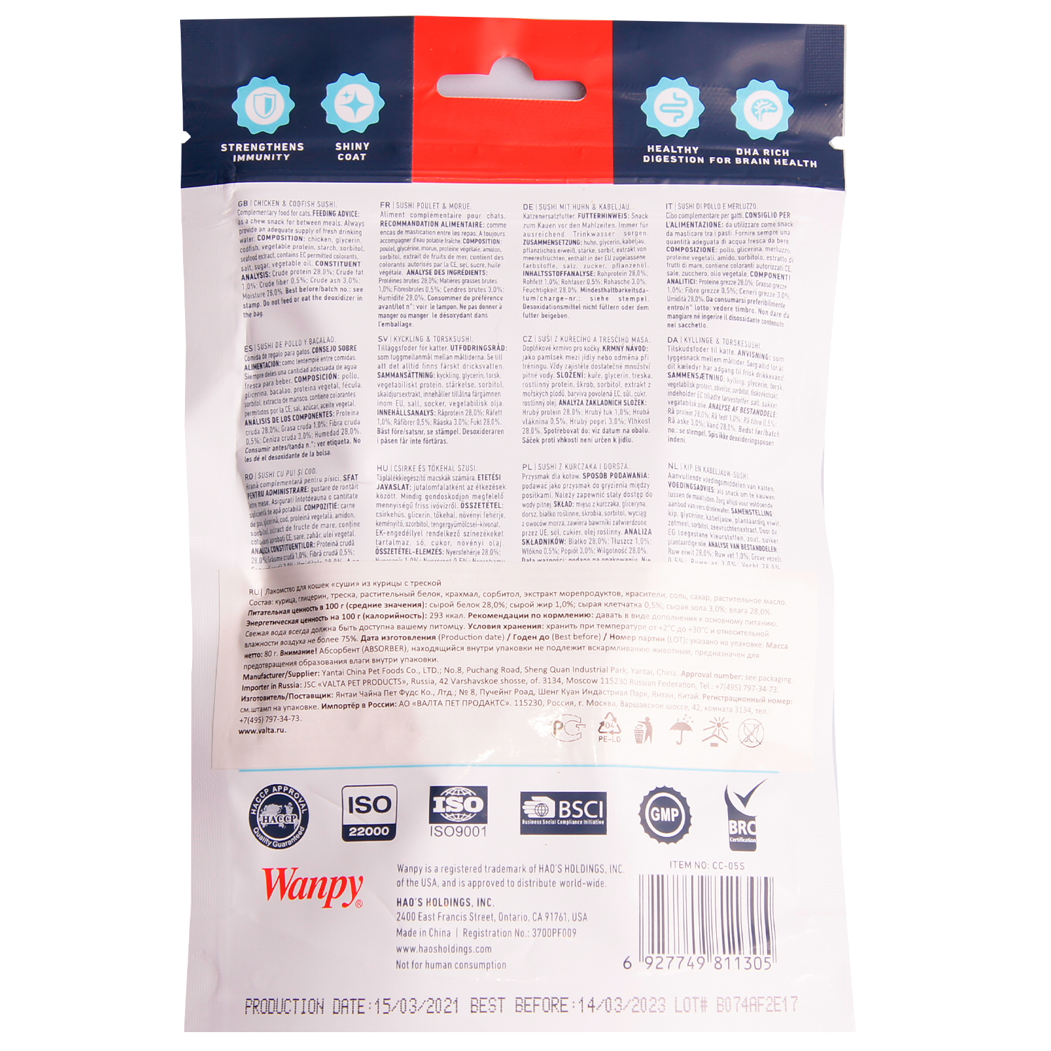 Состав: курица, глицерин, треска, растительный белок, крахмал, сорбитол, экстракт морепродуктов, красители, соль, сахар, растительное масло.