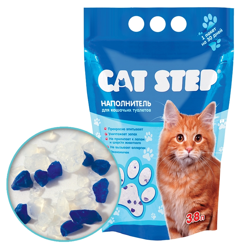 Cиликагелевый наполнитель для кошачьего туалета CAT STEP Arctic Blue с цветными синими гранулами моментально впитывает влагу и уничтожает запахи. Пористая структура кристаллов обеспечивает их высокую способность к поглощению жидкостей и запахов. Наполнитель препятствует размножению и развитию бактерий и грибков за счет своего неорганического происхождения. Наполнитель не требует постоянного контроля и ежедневной уборки кошачьего лотка. Содержимого пакета 3,8 л хватает в среднем на 1 месяц использования. Заполните сухой и чистый лоток наполнителем CAT STEP Arctic Blue слоем 3-5 см. Регулярно удаляйте экскременты и перемешивайте наполнитель для равномерного распределения свежих кристаллов. Примерно через 4 недели удалите использованные гранулы и замените их новой порцией наполнителя. Не выбрасывайте использованный наполнитель в унитаз.