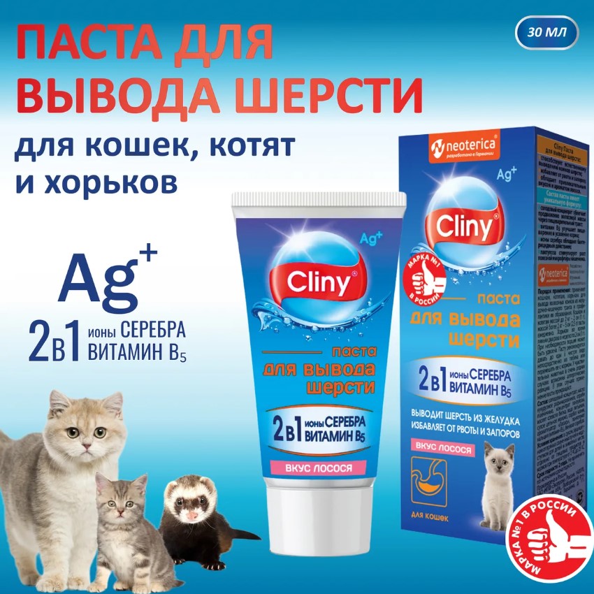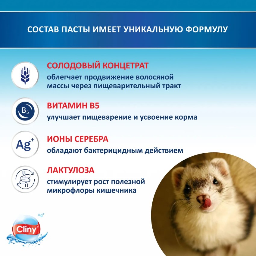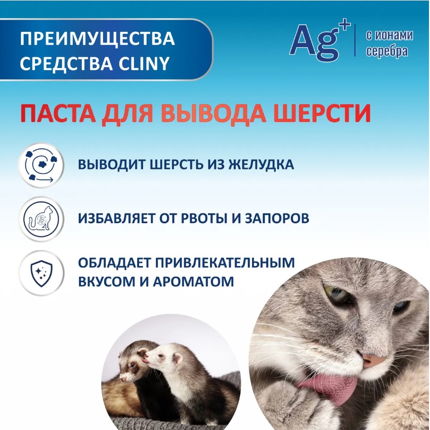 Паста для вывода шерсти Клини способствует естественному выведению комков шерсти из желудка животных.